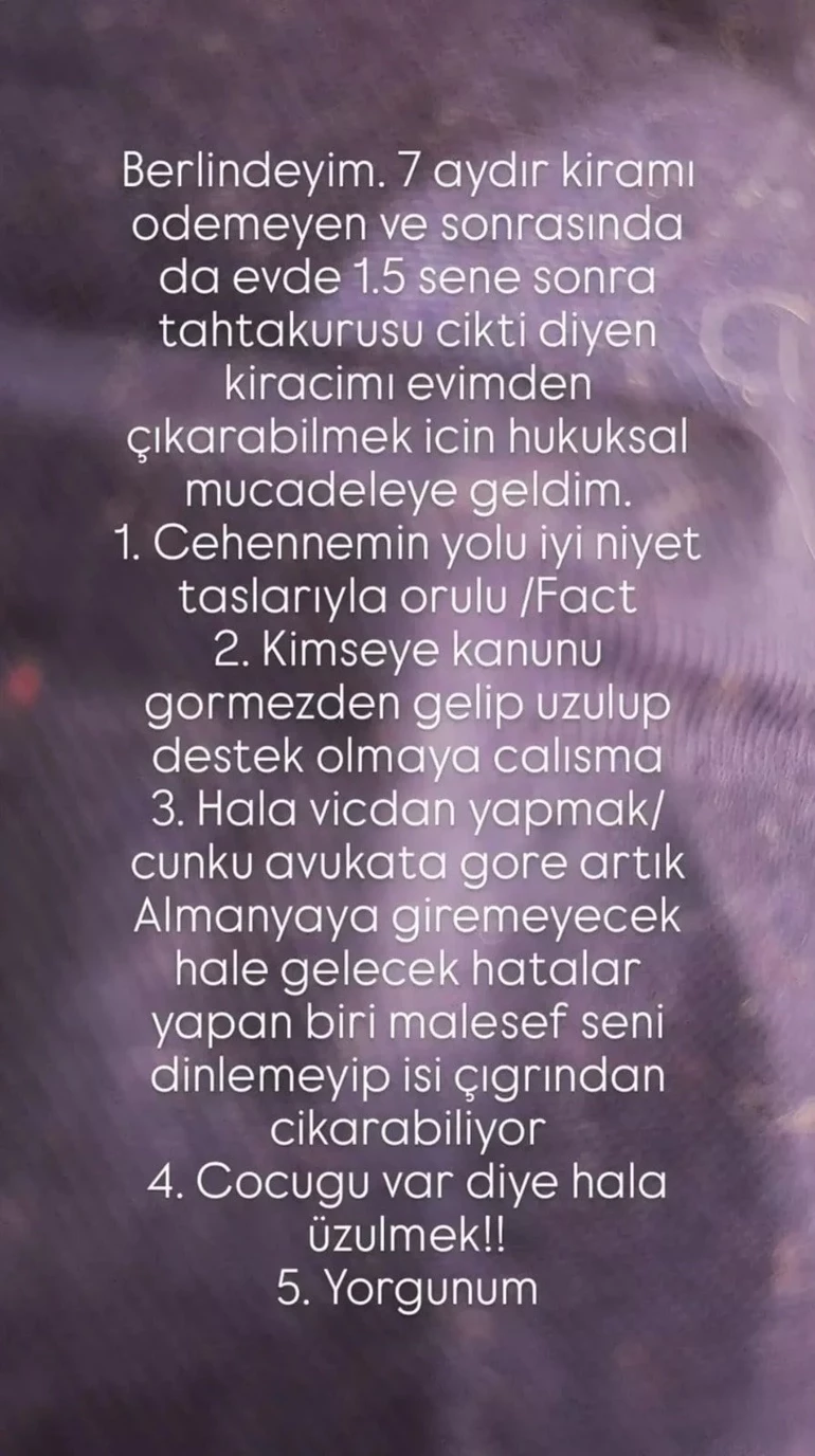 Berlin’e gittiğini ifade eden Ünsal, kiracısının evde 1,5 yıl sonra ortaya çıkan tahtakurusu gerekçesiyle kira ödemelerini durdurduğunu, bu nedenle evden çıkarabilmek için yasal adımlar attığını aktardı.